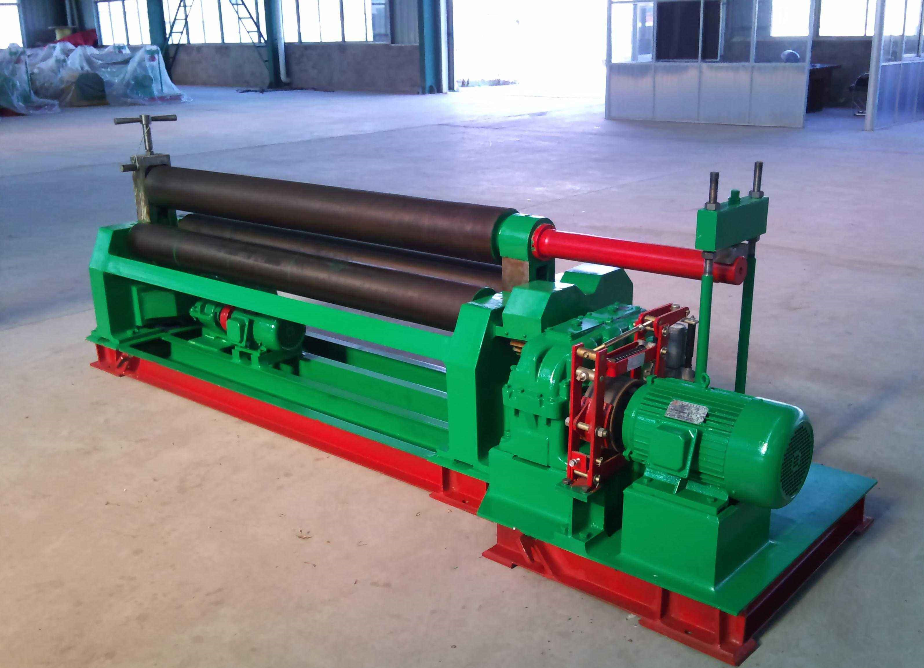 油作用于活塞作垂直升降運動,通過主減速機的末級齒輪帶動兩下輥齒輪嚙合作旋轉運動,為卷制板材提供扭矩。卷板機規格平整的塑性金屬板通過卷板機的三根工作輥(二根下輥、一根上輥)之間,借助上輥的下壓及下輥的旋轉運動,使金屬板經過多道次連續彎曲(內層壓縮變形,中層不變,外層拉伸變形),產生永久性的塑性變形,卷制成所需要的圓筒、錐筒或它們的一部分。