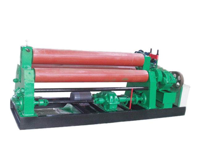 機械式三輥對稱式卷板機性能特點:該機結構型式為三輥對稱式,上輥在兩下輥中央對稱位置作垂直升降運動,通過絲桿絲母蝸桿傳動而獲得,兩下輥作旋轉運動,通過減速機的輸出齒輪與下輥齒輪嚙合,為卷制板材提供扭矩。該機缺點是板材端部需借助其它設備進行預彎。